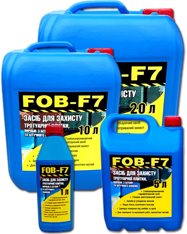 Цена на гидрофобизатор для бетона FOB-F7 – от 365 грн за литр. В наличии также упаковки 5 л, 10 л, 20 л. Чем больше упаковка, тем меньше цена за литр. Расход гидрофобизатора зависит от пористости поверхности и составляет 1 л на 5-10 кв. м.