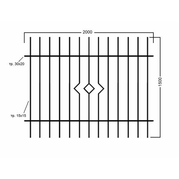 Кованый забор «Стиль» – это сочетание минимализма и декоративных элементов. В центре секции расположен аккуратный ромбовидный узор, который подчёркивает современный характер конструкции. Забор отлично подойдёт для участков, где ценят строгость и аккуратность линий.