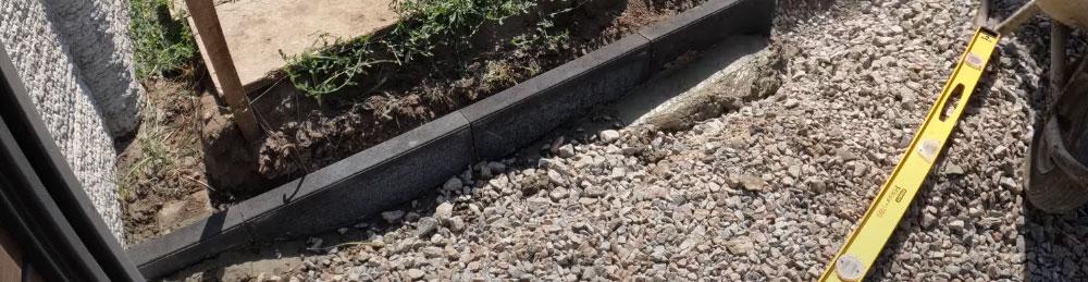 - По краях котловану встановлюються бордюри. Установка проводиться на цементно-піщаний розчин (1 частина цементу до 3 частин піску). За необхідності спочатку насипається і утрамбовується шар щебеню, достатній, щоб підняти бордюри на потрібну висоту.