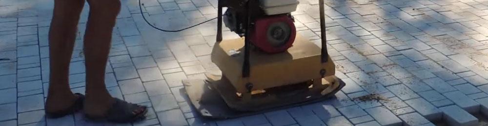 - Потім поверхню ущільнюють віброплитою з гумовою накладкою – це допомагає плитці остаточно «сісти» і додатково утрамбовує пісок у швах.