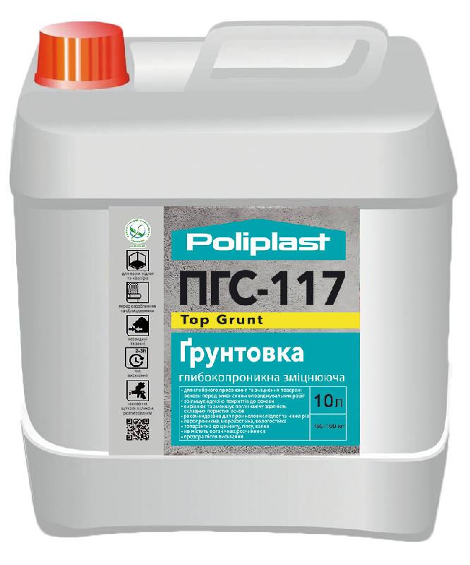Грунтовка глибокопроникна зміцнююча ПГС-117 Top Grunt – готова до використання рідина, призначена для покращення адгезії, зміцнення поверхні та зниження водопоглинання всіх видів неміцних, пухких і мінеральних основ, що обсипаються. Підходить для обробки цементно-піщаних, цементних, цегляних, бетонних, пористих бетонних поверхонь, а також гіпсокартонних листів перед облицювальними роботами, такими як кріплення керамічної та кам'яної плитки, теплоізоляційних плит, вирівнюючих та самонівелюючих розчинів на підлогу. Також використовується перед оздоблювальними роботами, включаючи нанесення штукатурок, шпаклівок, наклейку шпалер та фарбування. Ґрунтовка запобігає пересиханню розчинних сумішей у тонкому шарі, покращує розтікання нівелюючих розчинів, забезпечує рівномірне нанесення та знижує витрату фарби та шпалерного клею. Ідеальна для застосування при ремонті та реконструкції будівель та споруд, як усередині, так і зовні.