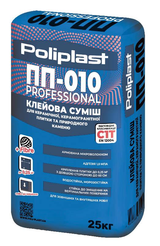 ПП-010 PROFESSIONAL - готова суха клейова суміш для кріплення різних видів керамічної плитки з водопоглинанням не менш 1% і природного каменю (наприклад, пісковика), з водопоглинанням не менше 3%, розміром не більше 400х400 мм на міцні мінеральні горизонтальні і вертикальні основи, стійкі до деформації (бетонні, цементно-піщані, цементно-вапняні, цегляні, основи з пористих бетонів і ін.).