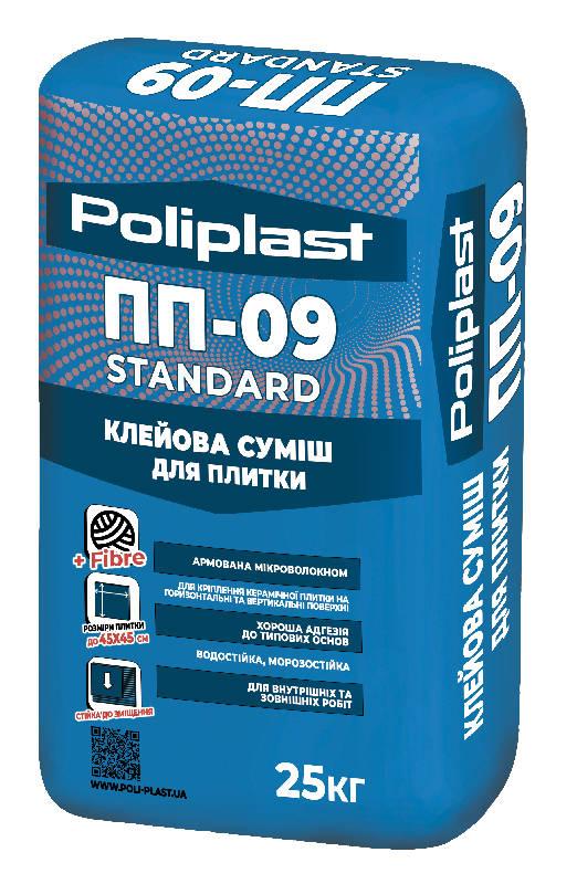 Клейова суміш для плитки ПП-09 STANDARD - призначена для облицювання стін і підлоги керамічною плиткою розмірами не більше 300 × 300 мм (з водопоглинанням не менше 3%) і аналогічних матеріалів по бетонним, цегляним, цементно-піщаних, цементно-вапняним та інших підстав , що не деформуються, усередині приміщень.
