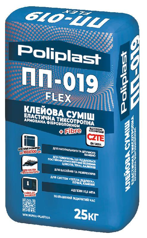 Клейова суміш еластична тиксотропна ПП-019 FLEX -готова суха клейова суміш армована фіброволокном для кріплення керамічної та склокерамічної плитки, плит і плитки з натурального та штучного каменю, керамограніту, плит великих розмірів та інших матеріалів з низьким водопоглинанням (менше 1%). На горизонтальні та вертикальні основи (бетонні, цементні, цементно-вапняні, цегляні, гіпсокартоні та ін.) та на основи, що піддаються постійним атмосферним впливам та періодичним деформаціям (поверхні печей, камінів, підлог з електричним та водяним підігрівом, терас, балконів, басейнів тощо). Ефективна при облицюванні поверхонь без видалення старої плитки («плитка на плитку») за виключенням глазурованої.