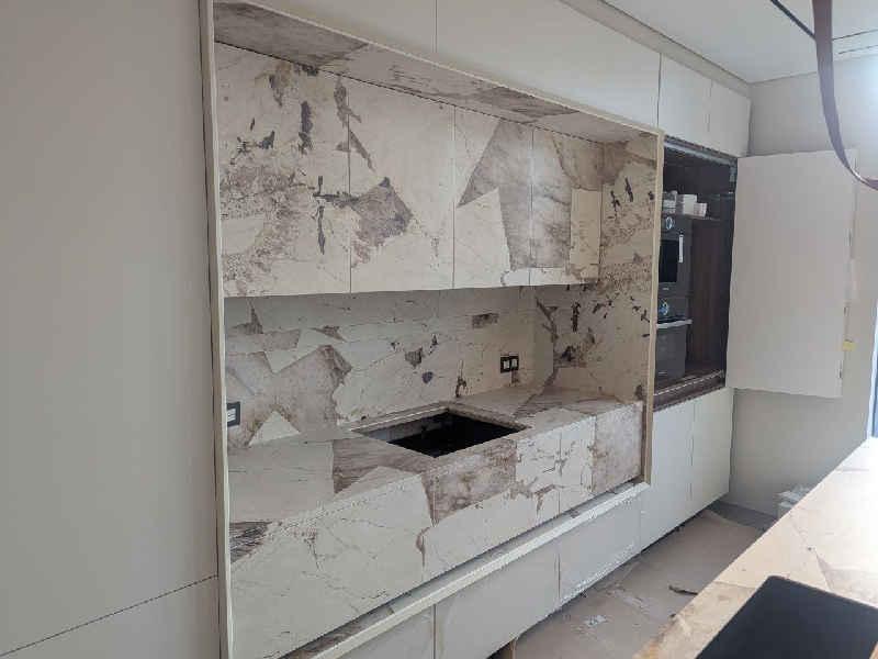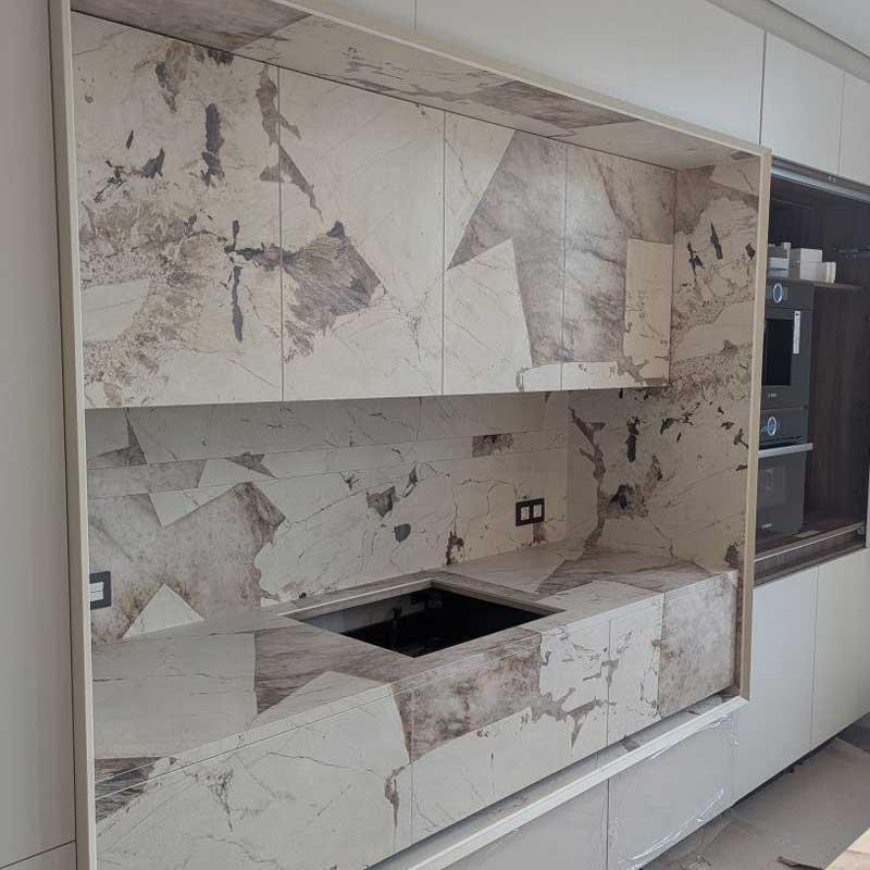 Таке рішення дозволяє створити єдину композицію, де робочі поверхні, фасади і декоративні елементи гармонійно поєднуються між собою. Керамограніт відрізняється високою міцністю, стійкістю до вологи, температур і механічних пошкоджень, тому ідеально підходить для зон з інтенсивною експлуатацією.