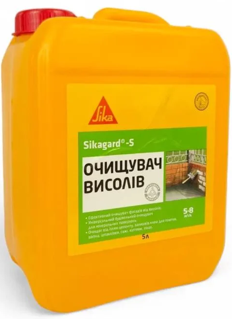 Sikagard-S – ефективний очисник, призначений для видалення висолів та інших забруднень із мінеральних поверхонь. Засіб застосовується для очищення фасадів із цегли, природного каменю, керамічної плитки та інших пористих матеріалів, на яких з’являються сольові відкладення внаслідок міграції солей з товщі стін.