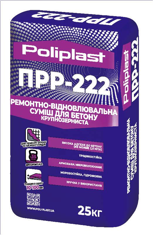 Суміш ПРР-222 призначена для ремонту і відновлення бетонних і залізобетонних конструкцій. Ефективна для ремонту сколів, пустот, раковин, нерівностей і інших дефектів на поверхнях залізобетонних і бетонних підстав, товщиною шару від 10 до 100 мм.