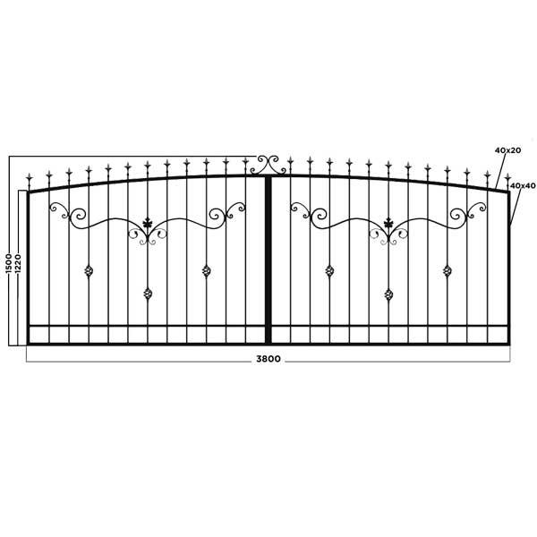 Ковані ворота «Наталі» – це вишукане поєднання міцної металевої конструкції та художнього ковання. Дизайн виконаний у класичному стилі: вертикальні прути доповнені декоративними завитками та орнаментом, а верхня частина оформлена у вигляді арки, що надає конструкції легкості та завершеності.