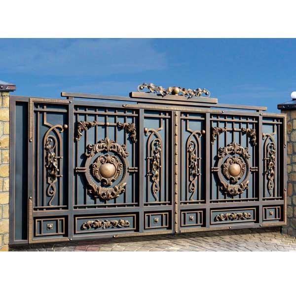 Розсувні ковані ворота з решіткою та орнаментом – стильне і практичне рішення для сучасного будинку. Конструкція відрізняється масивністю і багатими декоративними елементами: завитки, рослинні мотиви і геометричні візерунки утворюють гармонійну композицію з чіткою симетрією. Золотисто-бронзове покриття підкреслює глибину ковки і надає воротам елегантний класичний вигляд.