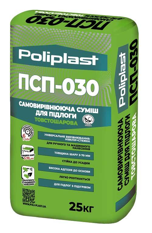 Самовирівнююча суміш для підлоги ПСП-030 – готова суха суміш для нівелювання практично усіх типів гідрофільних основ, стійких до деформації (цементних, бетонних, керамзитобетонних та інших) перед улаштуванням фінішних покриттів (паркет, ламінат, ковролин, лінолеум, плитка і інші) шаром від 3 до 50 мм (70 мм для невеликих ділянок) всередині сухих приміщень. Дає рівну, гладку, міцну горизонтальну поверхню.
