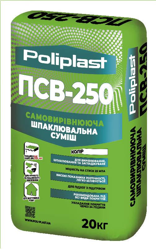 Самовирівнююча суміш ПСВ-250 призначена для вирівнювання, шпаклівки та загладжування нових і старих горизонтальних підстав: бетонних, цементно-піщаних, старих основ з керамічної плитки, основ з натурального каменю, тераццо, міцних клейових розчинів, магнезитових стяжок всередині будівель.