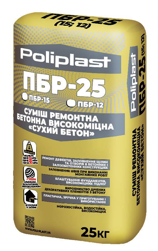 Суміш ПБР-12 (15, 25) «Сухий бетон» призначена для усунення дефектів бетонних конструкцій, заповнення отворів в залізобетонних стінах, перекриттях і в місцях проходження інженерних мереж і комунікацій, заповнення швів між елементами конструкцій з бетону при виробництві монтажних робіт.