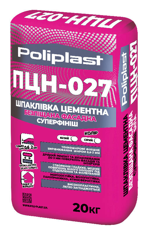 Шпаклівка фасадна (суперфініш біла) ПЦН-027 - готова суха суміш для фінішного тонкошарового вирівнювання підстав, які не схильні до деформації (цегла, легкий бетон, бетон, цементні, цементно-вапняні і аналогічні штукатурки і т.д.), як зовні так і всередині сухих і вологих приміщень.